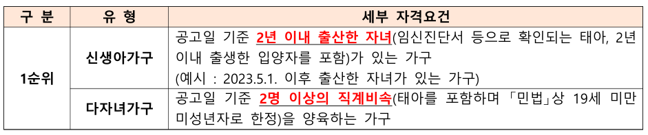 특히 신혼부부, 예비 신혼부부, 다자녀 가구, 신생아 가구는 우선공급 대상이라 당첨 확률이 더 높습니다.